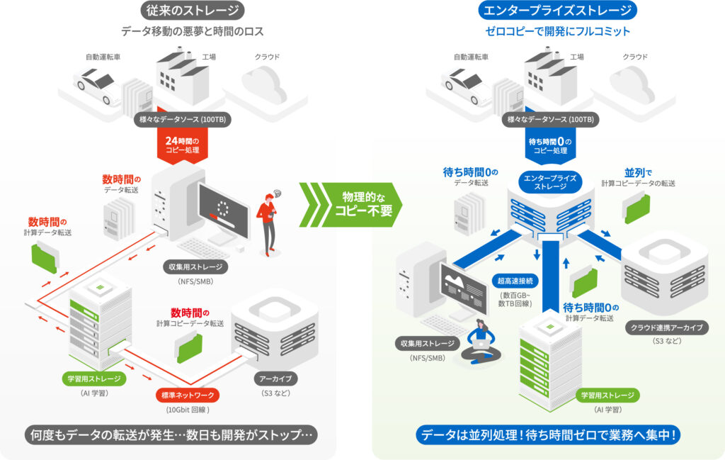 例えば自動運転車のデータ処理で言えば、開発車両が1日走行して集めたセンシングデータ田や画像データが 100TB あるとします。これを普通のストレージを使って、AI学習用のストレージへ送り込むとすると、10Gbit回線で約24時間かかり、学習完了後、結果をアーカイブへコピーするところで、また膨大な時間を要します。データの「移動」だけで数日ロスする計算です。