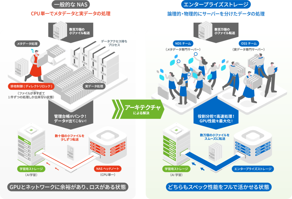 大規模AI基盤において、エンタープライズストレージが必要な最大の理由は、単に「太い土管(スループット)」を持っているからだけでなく、この「超高速なメタデータ処理能力」を持っているためです。