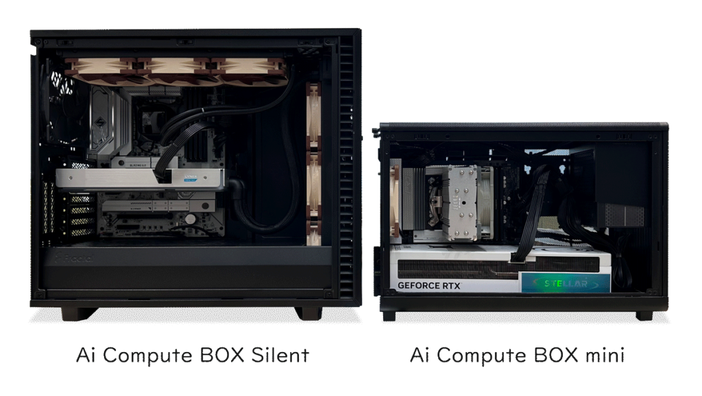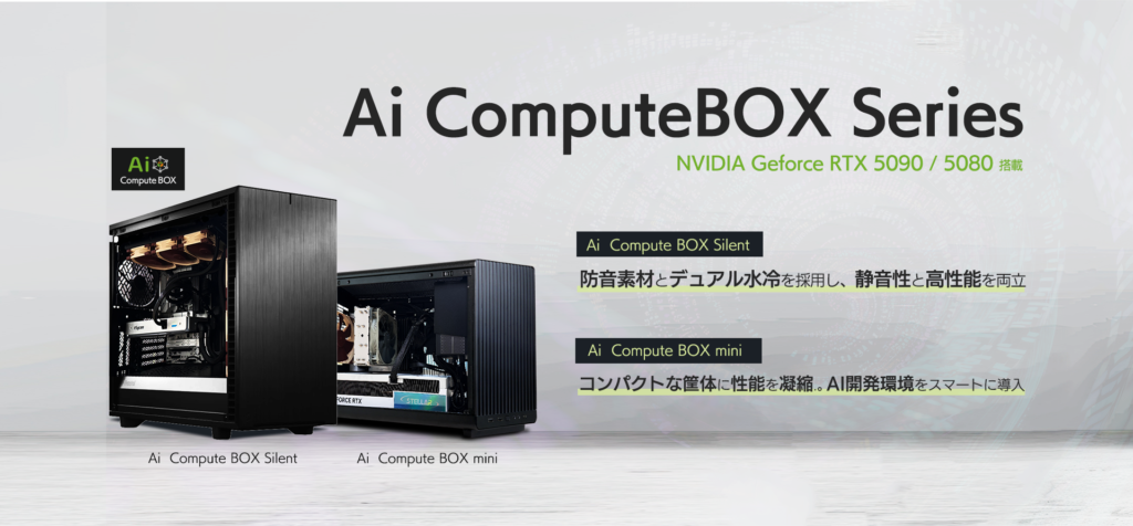 静音性を重視した「Ai Compute BOX Silent」と、限られた設置スペースにも対応する「Ai Compute BOX mini」の2シリーズを展開し、研究開発、AI推論、シミュレーション、コンテンツ制作など、さまざまな高負荷ワークロードに応えます。