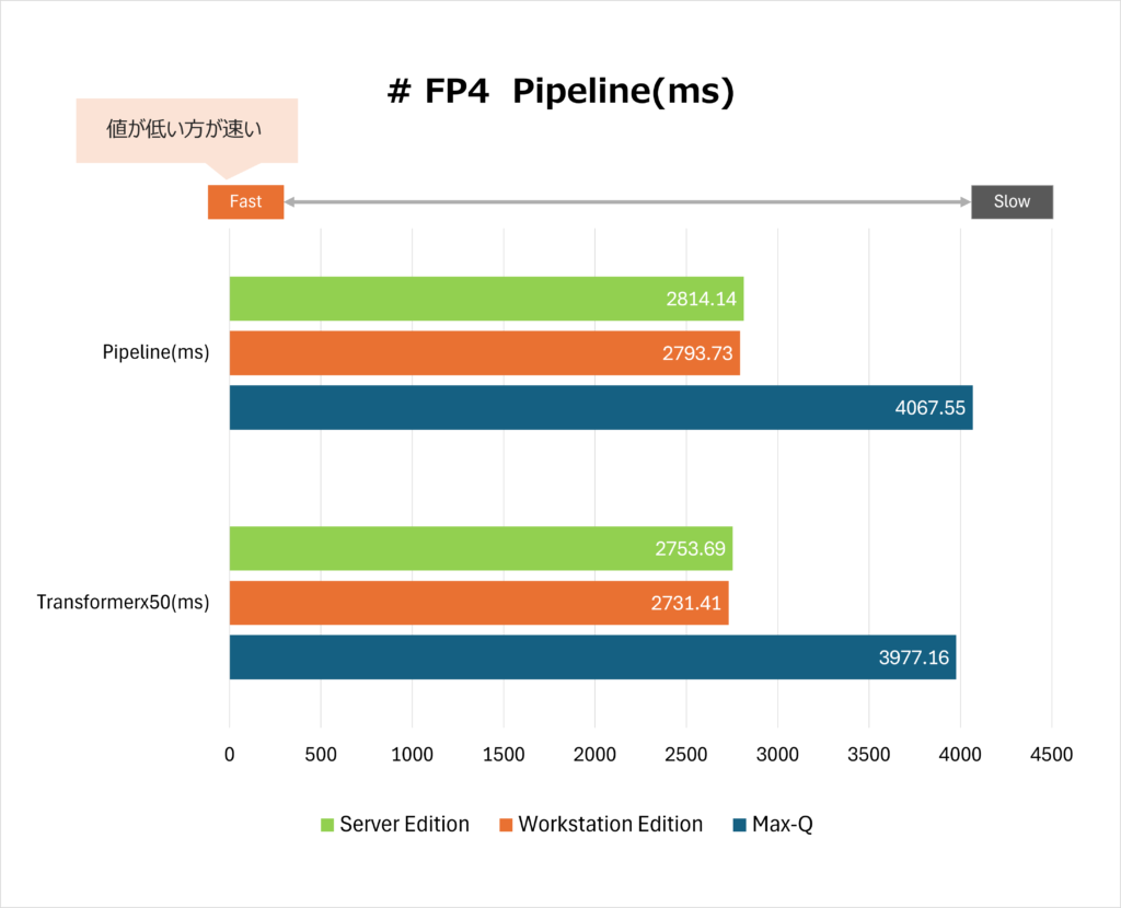 最も高性能なWorkstation Editionで見ると、Transformerx50(2,731.41 ms)はPipeline(2,793.73 ms)より約2.2%速く処理されています。