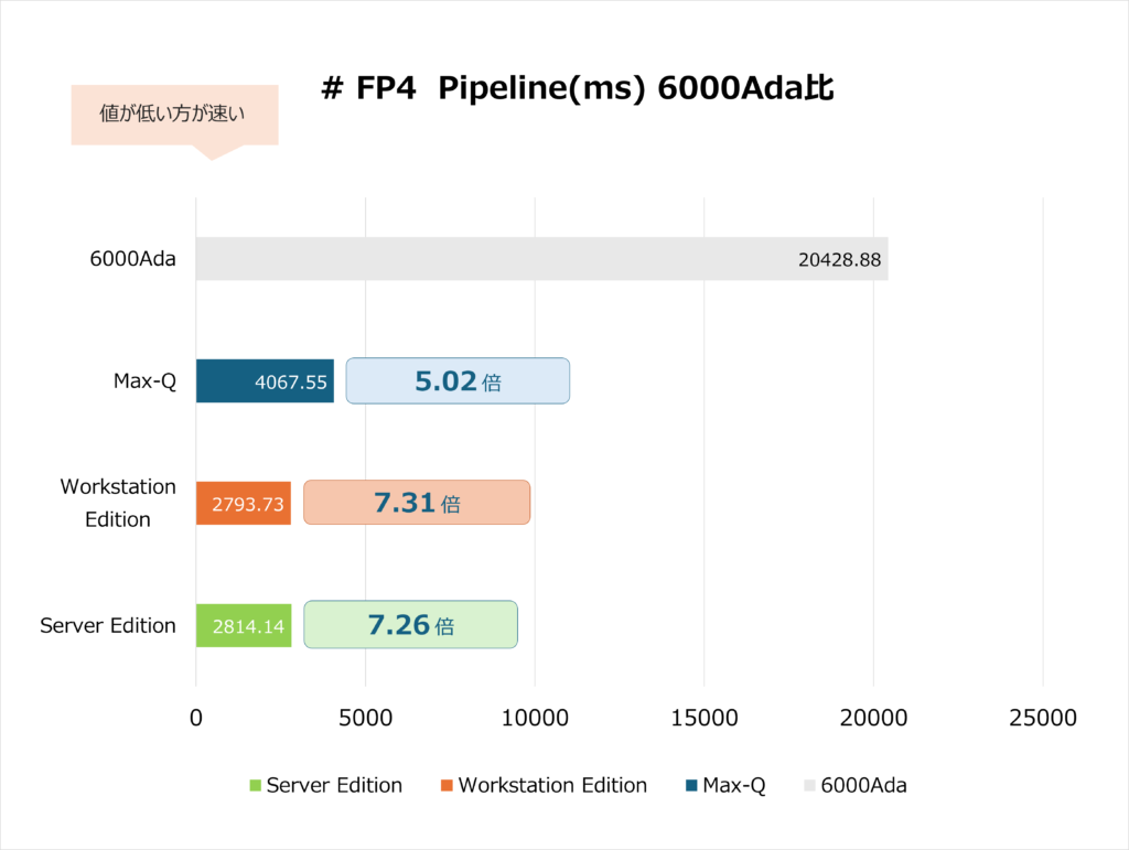 上のグラフはNVIDIAのプロフェッショナル向けGPUラインアップにおける、FP4データ処理パイプラインの実行時間(ミリ秒)を比較したものです。比較対象は、旧世代の「6000Ada」と、新世代Blackwellの「Max-Q」、「Workstation Edition」、「Server Edition」の3つのエディションです。
